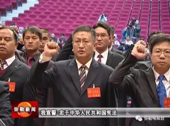 在钊辉的监督下,新当选的弥勒市第二届人大常委会主任、副主任、委员,市人民政府市长、副市长,市法院院长,面对国徽,向宪法郑重宣誓。