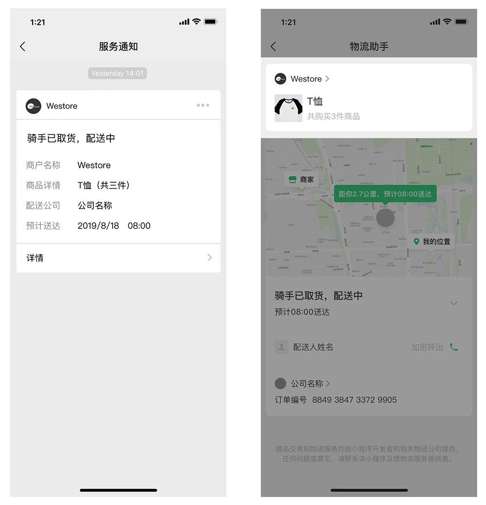 配送详情的服务通知可跳转商家小程序,提升用户回访